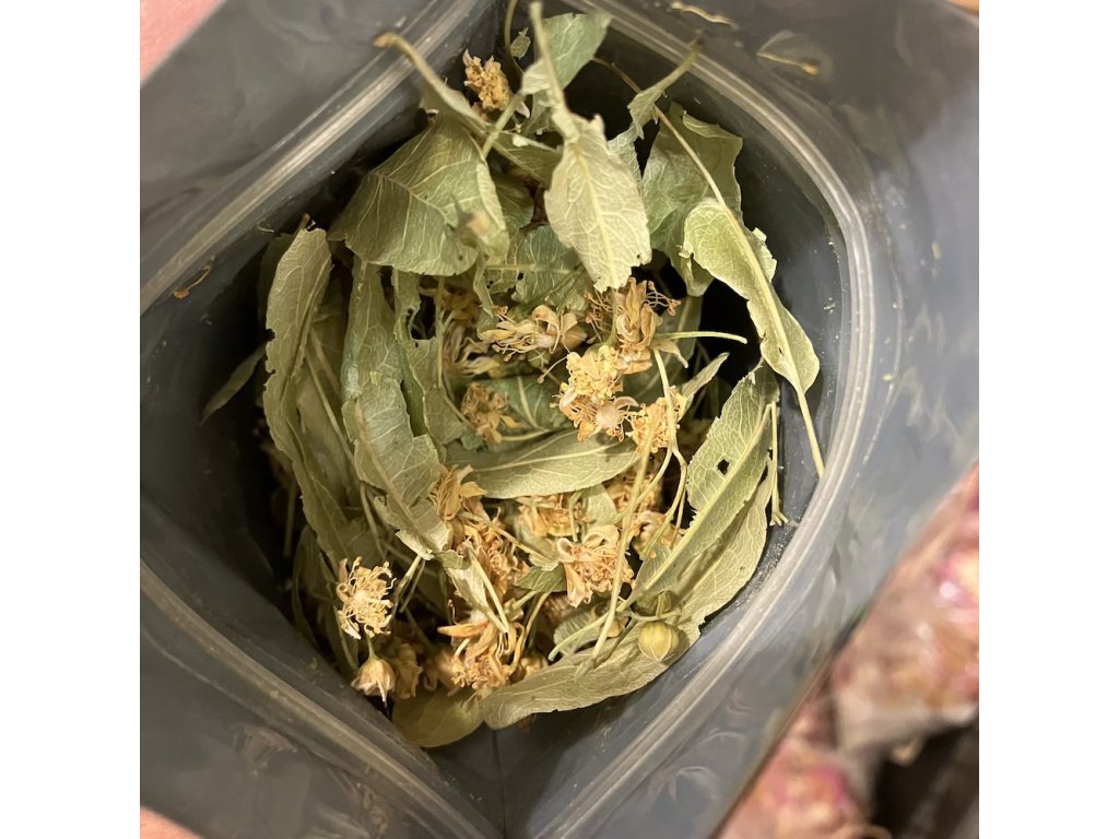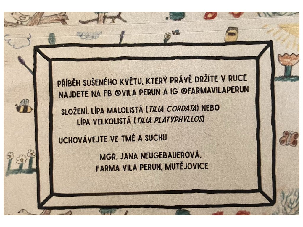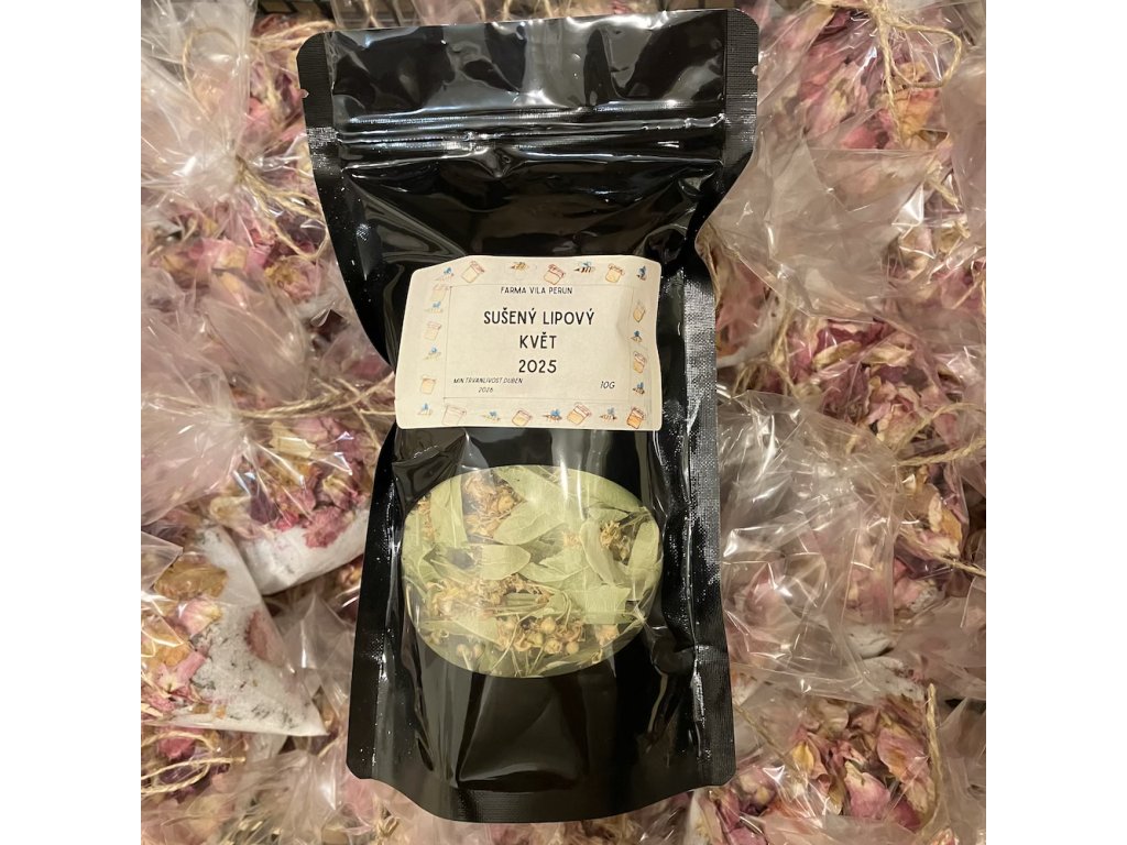 Lipový květ, ručně sbíraný ze stoletých lip na naší farmě uprostřed lesů pod vrchem Džbán a šetrně sušený v temnu.